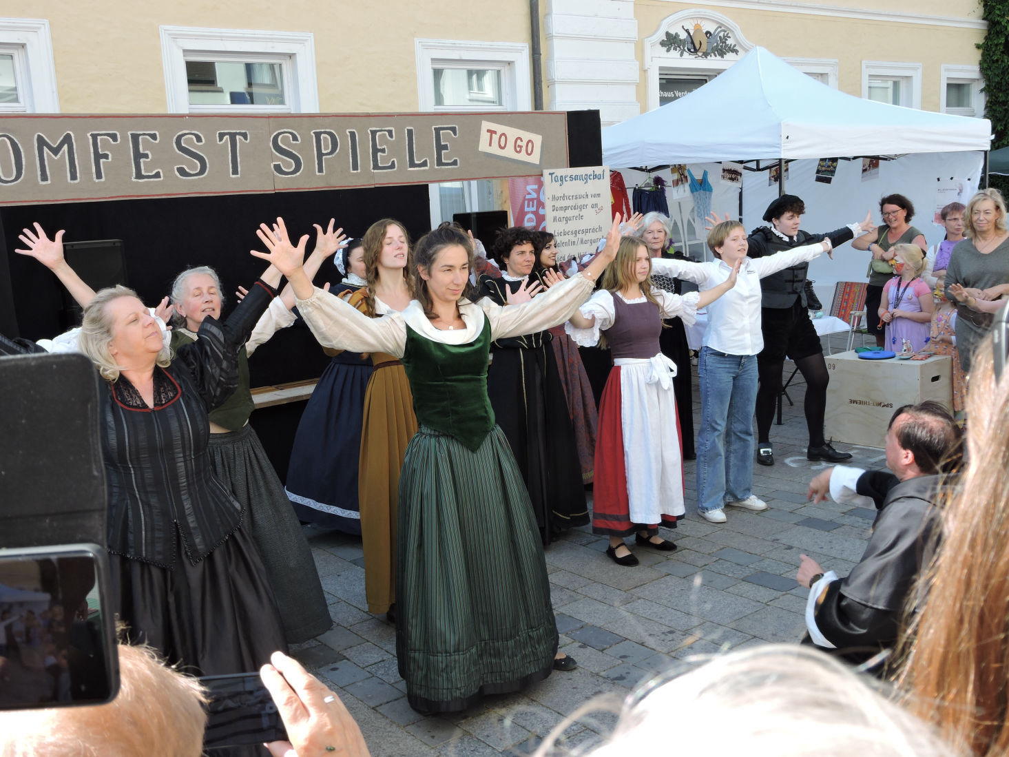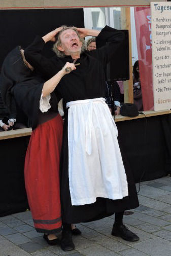 Eine Bude von vier Metern Länge und zwei Metern Tiefe stand in der Fußgängerzone der Verdener Innenstadt. In der Bude saßen einige der Darstellenden der diesjährigen Saison in ihren Kostümen und warteten – doch worauf? Schauspieler Uwe Pekau moderierte in seinem Kostüm des Dompredigers, und bot ausgewählte Szenen aus dem Stück "Die rebellische Hexe" an, welche für einen Obulus "gekauft" werden konnten und dann vorgeführt wurden. Und gleich zu Beginn zeigten sich die Besucher:innen offen für diese Art des kurzweiligen Theatervergnügens und kauften Szenen wie "Versuch des Dompredigers Margarethe zu ermorden", "Der Inquisitor wie er leibt und lebt", "Das Lied der Mätresse", "Liebesgespräch Valentin/Margarethe", "Verschwörung der Frauen" oder "Verdens Frauen".