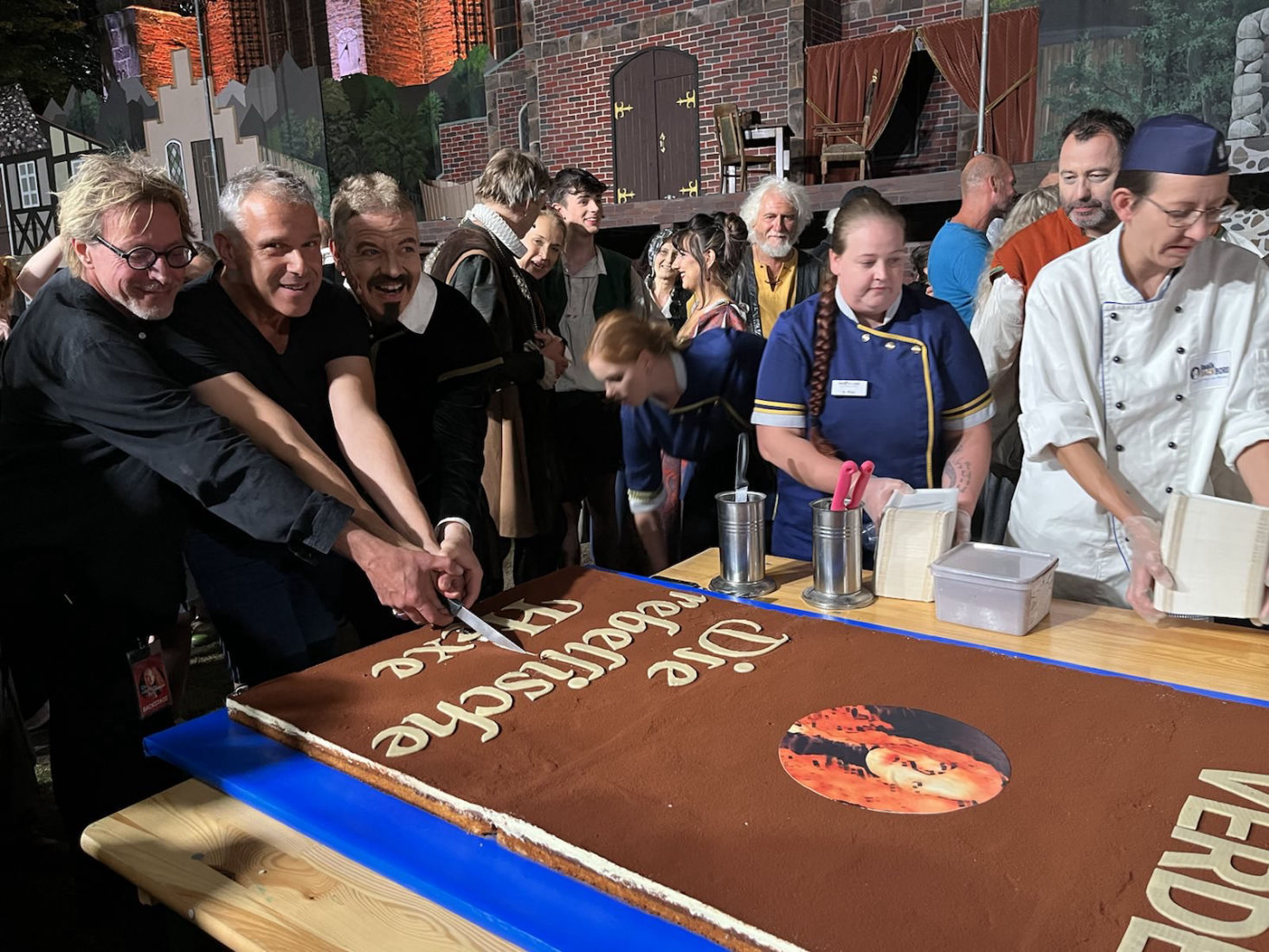 Am Ende wurde eine große Torte, welche die Bäckerei Baalk Backbord gezaubert hatte, auf die Bühne gebracht und an alle Anwesenden verteilt. Ein süßer Abschluss der Saison. Anschließend feierte das gesamte Domfestspiel-Team eine große Abschlussparty im Gastrozelt - bis in die früh wurde getanzt, geredet, gefeiert und so manche Träne vergossen ... Nunfreuen sich alle auf die Saison 2025.